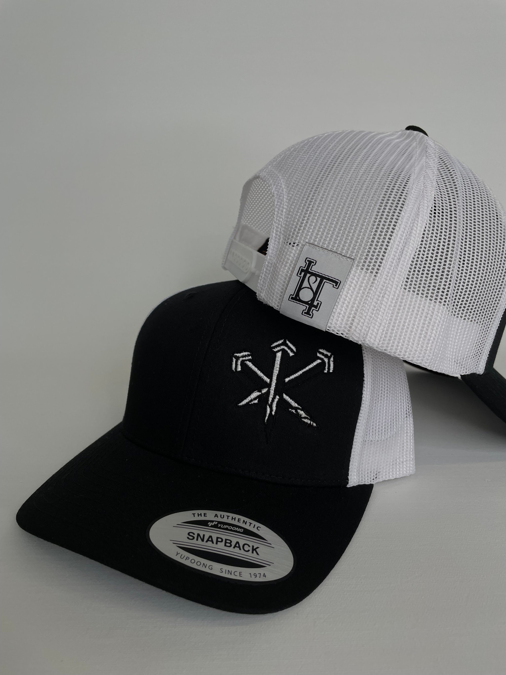 LTS Hard As Nails Retro Trucker Cap: Black cap with contrasting White mesh on the back. Featuring 3 traditional tattoo style nails at the front and completed with logo detailing at the back and an adjustable SnapBack closure for added comfort.